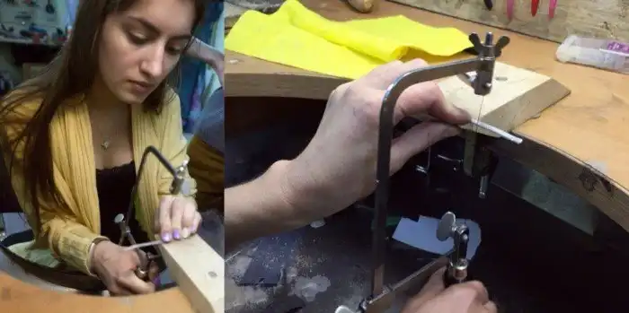 После этого с помощью ниточки я измерила обхват пальца и отрезала требуемое количество. Это было сложно, потому что лобзик нужно держать строго вертикально и следить за тем, чтобы он не «уезжал» в сторону. Здесь мне помогли, так как это важный этап – спилы должны быть идеально ровными, чтобы потом соединиться.