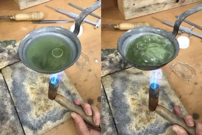 Теперь пора отбелить серебро в кислоте, чтобы вернуть изначальный цвет – оно после переплавки темнеет.