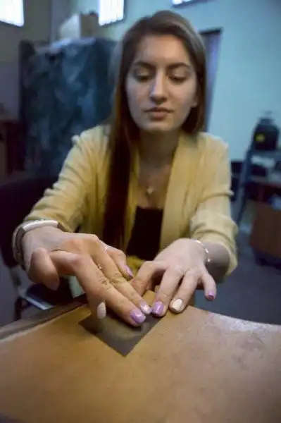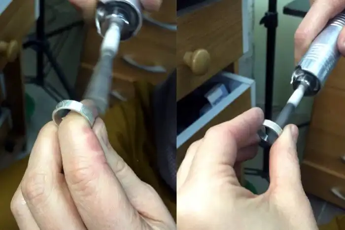 После этого кольцо проходит последний этап шлифовки на машинке с быстро крутящимся резиновым «колесом». От быстрого трения кольцо мгновенно нагревается и после каждого прикосновения к «колесу» его нужно опускать в холодную воду.