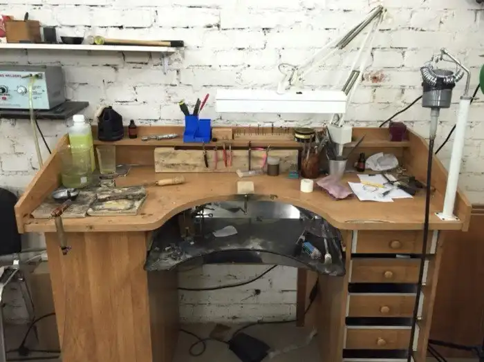 Так выглядит рабочее место ювелира – ничего роскошного, а ведь здесь обрабатывается не только серебро, но и золото, и драгоценные камни. Внизу педалька для шлифовочной машинки.