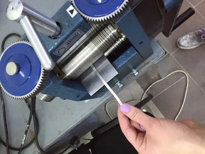 Охладив получившуюся «колбаску» в холодной воде, мы перешли к обкатке. Она происходит в два этапа: сначала нужно задать ширину кольца (правая часть машинки), а потом – толщину (левая часть). Колбаску вставляешь в проем, крутишь ручку и она проползает через отверстие. Обкатка происходит постепенно, на каждый из этапов примерно 30 прокруток. То есть нельзя сразу взять и за одну прокрутку сплющить металл – он тогда треснет и надо будет начинать заново.