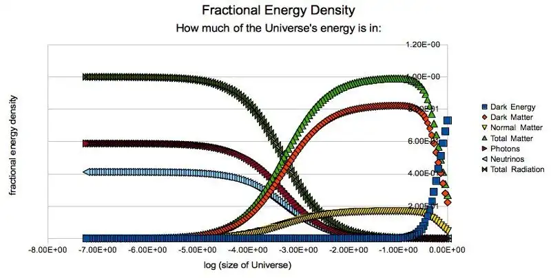 С тех пор, около 6 миллиардов лет назад, плотность материи начала снижаться, а темная энергия оставалась постоянной. В настоящее время темная материя составляет около 68% общей энергии Вселенной, а материя упала до 32% в общем (27% темная материя и 5% обычная материя). С течением времени, в будущем, плотность материи будет продолжать падать, тогда как плотность темной энергии будет оставаться постоянной, темная энергия будет все более и более преобладающей.