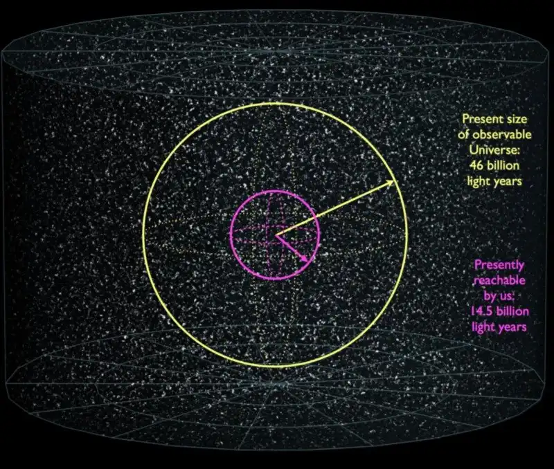 Желтым обведен нынешний размер видимой Вселенной: 46 миллиардов световых лет; розовым обведен достижимый для нас размер: 14,5 миллиарда световых лет
