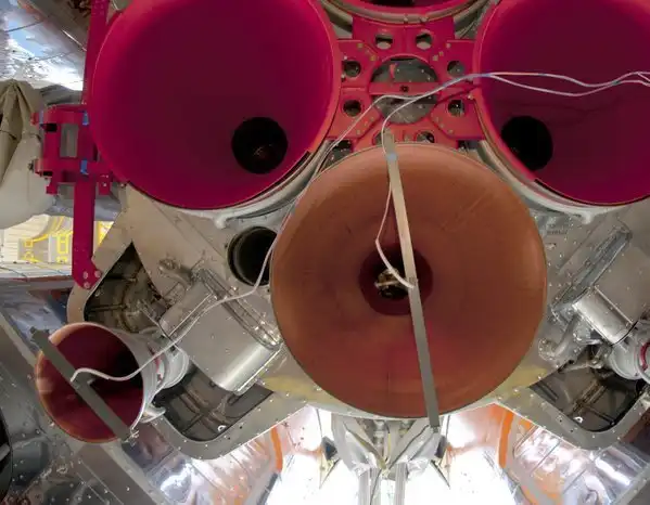 Камера сгорания двигателя шаттла SSME, использующая тот же принцип, отверстие запальника показано стрелкой
