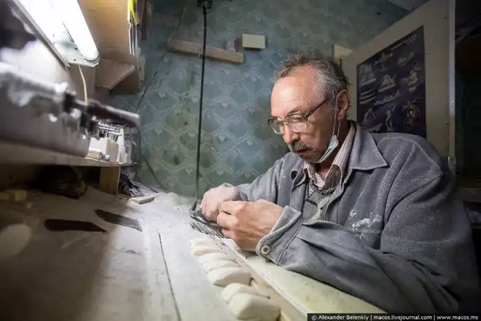 Владимир занимается художественной резьбой пятнадцать лет, но это далеко не единственная его профессия. Сегодня ему 62, и бОльшую часть жизни он был танцором в местном ансамбле. Потом сменил несколько профессий, артисты рано выходят на пенсию. Но нашёл себя именно в этой резьбе. Вспоминает, что мама ему рассказывала о том, как маленьким мальчиком он легко вырезал разные фигурки и оружие из деревяшек. Говорит, что занимается этим делом не столько ради заработка, сколько ради самого процесса и собственного удовольствия. И ещё, чтобы побыть наедине с собой: дома у Владимира целая вереница внуков разных возрастов.