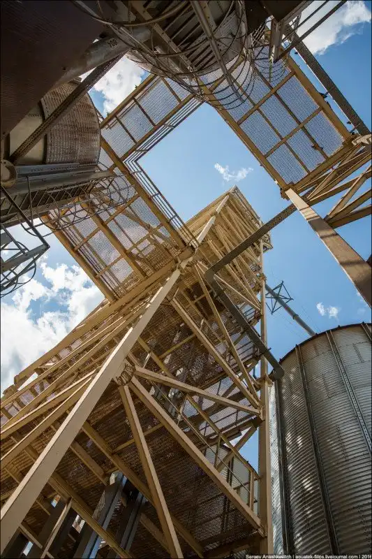 Из емкостей-хранилищ при помощи огромного и мощного насоса-турбины зерно «перекачивается» через высокие колонки на первичную переработку.