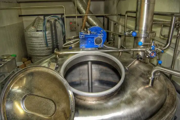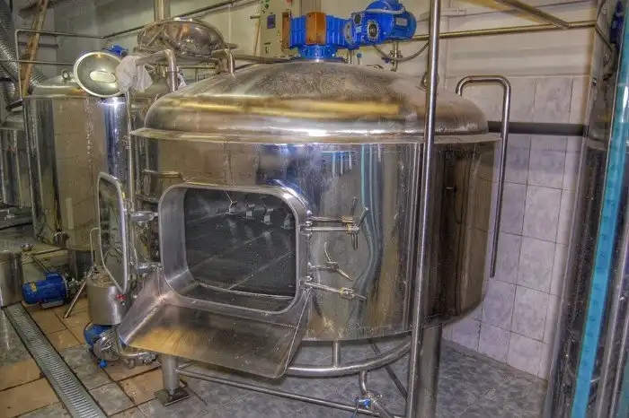 Справа — люк для выгрузки дробины фильтр-чана, левее лесенки — однотонный заторно-сусловарочный котёл, а далее за ним — вирпул.