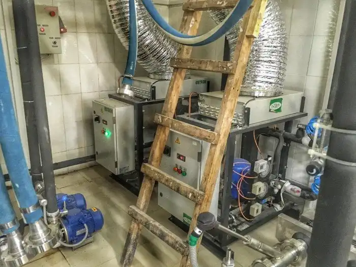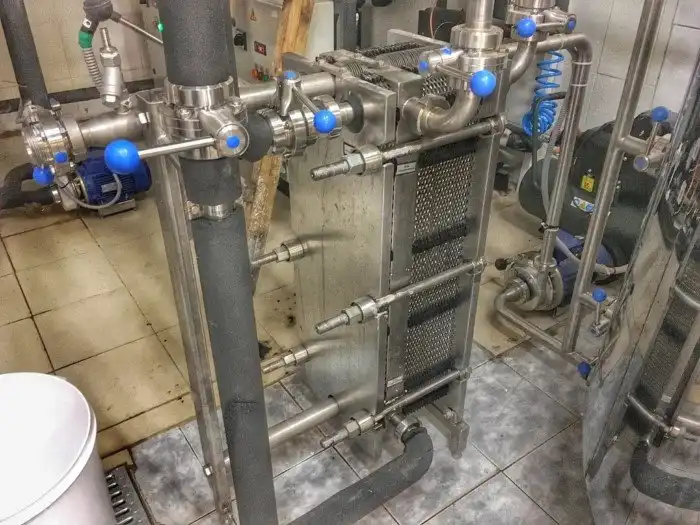 Слезаем вниз. Охладитель сусла. Через него сусло перекачивается в танки брожения, чтобы стать пивом.