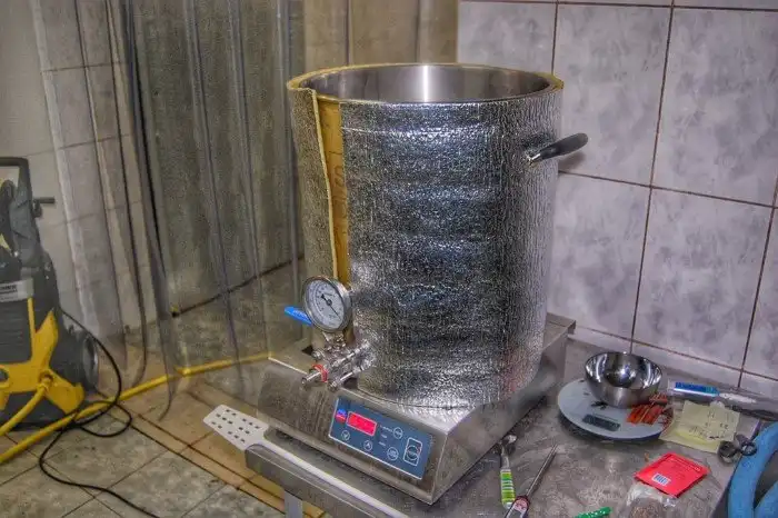 Парогенератор. Правая чёрная труба над парогенератором — это такой толстый электрокабель. Для питания мощной установки производства пара требуется серьёзная электроэнергия. Паром здесь нагревается вода для затирания сусла, а также варочный чан.