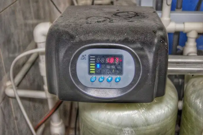 Справа — бак запаса холодной подготовленной воды. Слева — умягчающие фильтры с системой регенерации, которая поочерёдно переключает и восстанавливает наполнитель в каждом баллоне. Один фильтр регенерируется солью, а второй в это время работает. Потом наоборот.