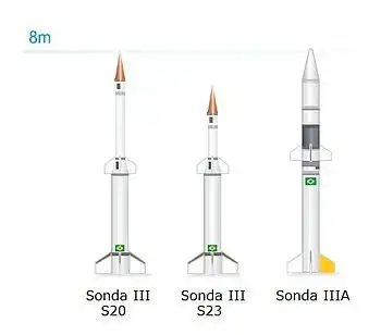 Следующий представитель семейства - Sonda III, являлась дальнейшим развитием предыдущего представителя. Ее разработка была начата в 1971 году под руководством Хайме Боскова, имевшего 10-летний опыт работы во Франции, уже к тому моменту обладавшей собственными средствами выведения. Он в значительной мере систематизировал работу и организовал полноценное сотрудничество "гражданской" и "военной" части отрасли. Ракета стала двухступенчатой, при этом, в качестве второй ступени была реализована незначительно измененная Sonda II, а на первую поставлен двигатель бразильской разработки S30. Ее размеры резко увеличились до 8 метров при общей массе в полторы тонны, она была способна доставить уже около 140 кг на 250 км. Первый пуск был осуществлен 26 февраля 1976 года.