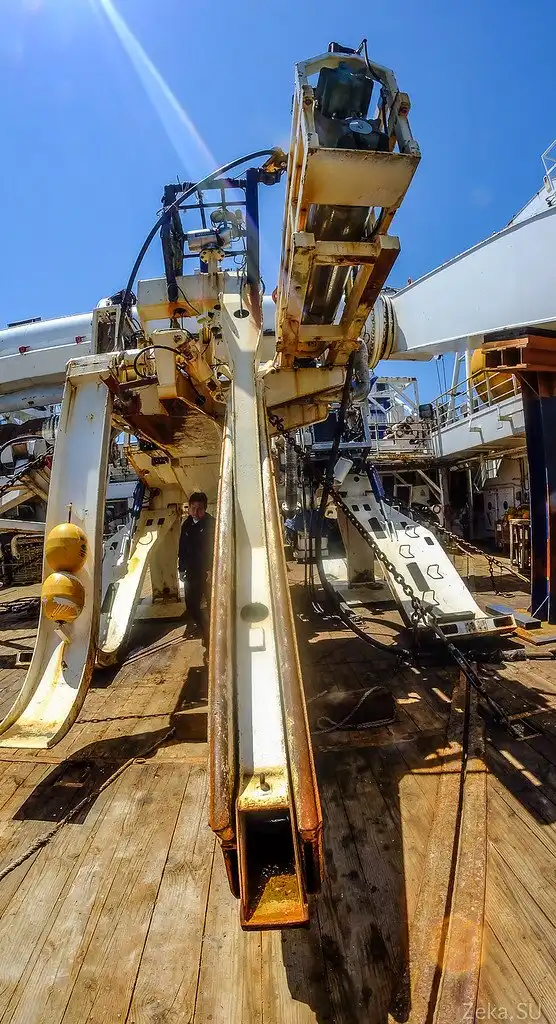Как вы видите, тут установлены два грузовых крана. Кран для опускания плуга, он откидывается назад как на наших военных килекторных судах , кстати совсем новый. Команде пришлось его недавно заменить на ремонте в Сингапуре. Второй подобный кран находится с левого борта и предназначен для работы с подводным роботом.