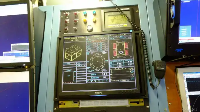 А вот это уже кормовая рубка управления. Тут более чуткие и тонкие инструменты управления судном. С помощью этих джойстиков и системы стабилизации можно двигать корабли буквально по метру вправо-влево: