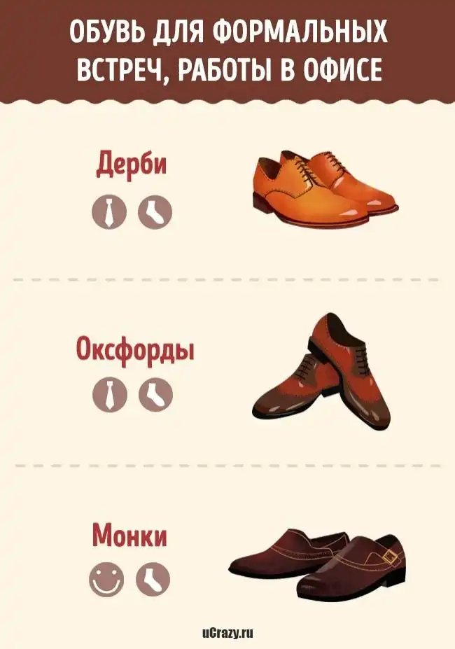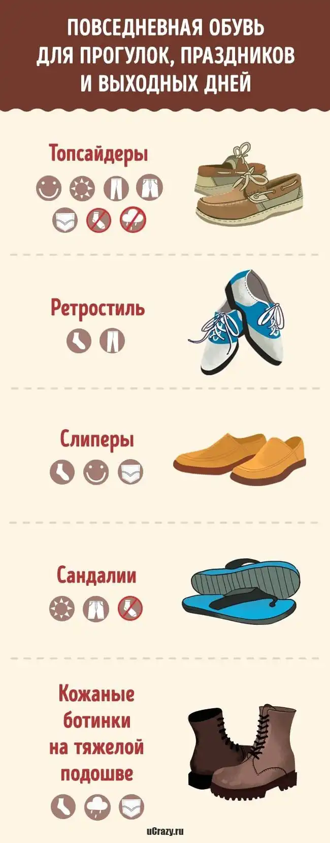 В помощь тем, кому небезразличен его внешний вид, uCrazy.ru публикует гид по мужской обуви: сочетания цветов, фасонов и стилей. Ведь всегда выглядеть на все 100% не так уж и сложно, зато как приятно!
