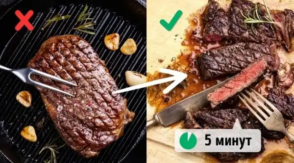 Даже если вам обычно не терпится попробовать готовое блюдо, в случае с мясом лучше подождать пару-тройку минут, прежде чем его резать. Так все соки распределятся более равномерно, а вкус станет насыщеннее.