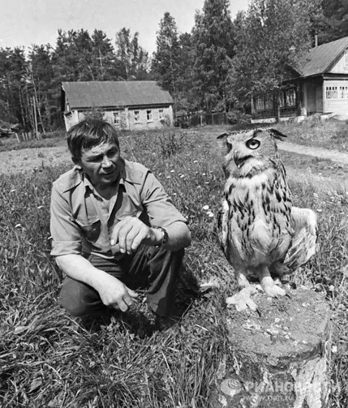 Работник зообазы Российской киностудии “Центрнаучфильм” с филином Фомкой, неизменным символом телепередачи “Что? Где? Когда?”. © РИА Новости, Эттингер