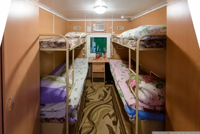 Часть из них – жилые, в них буровики живут по 4 человека. Вагончики разделены на тамбур с вешалкой, умывальником и шкафов и непосредственно жилую часть.