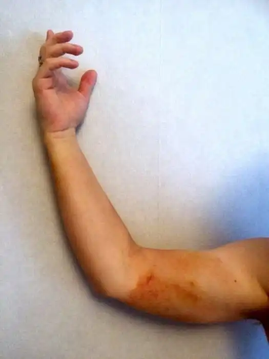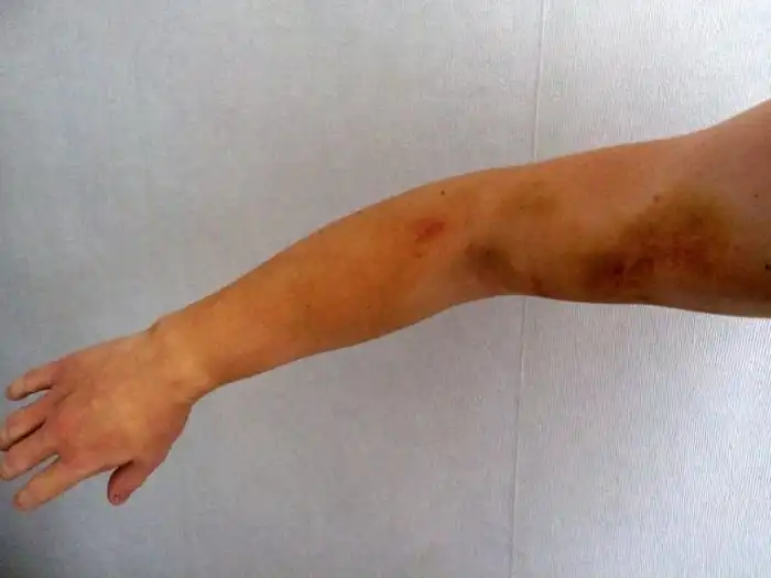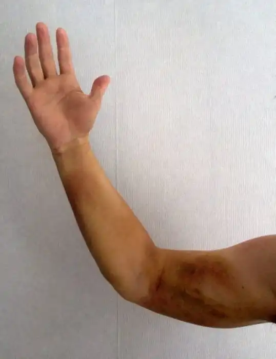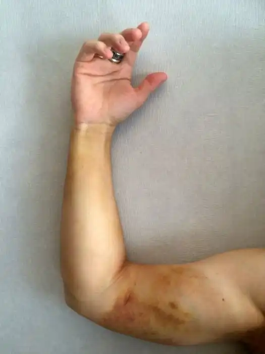 К концу вторых суток отек спал полностью, остался синяк на всю правую руку. Сжимать что-то правой рукой почти невозможно.