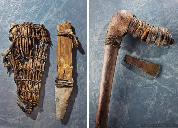 Кроме топора, у Эци были каменные орудия, включая мустьерские наконечники для стрел, кремневые скребок и нож. Историки говорят, что если бы каждый из этих предметов был бы найден рядом с мумией отдельно, то Эци можно было бы отнести к палеолиту, мезолиту, неолиту и медному веку. Впервые ученые столкнулись с таким разнообразием орудий труда из разных эпох у одного человека.