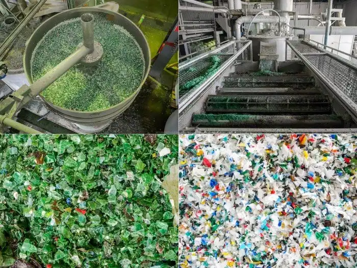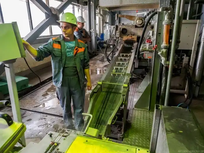 Бутылка отмывается снаружи, растворяется клей, которым была приклеена этикетка. После серии моек — очередной пост ручной сортировки и магнитная металлосепарация.