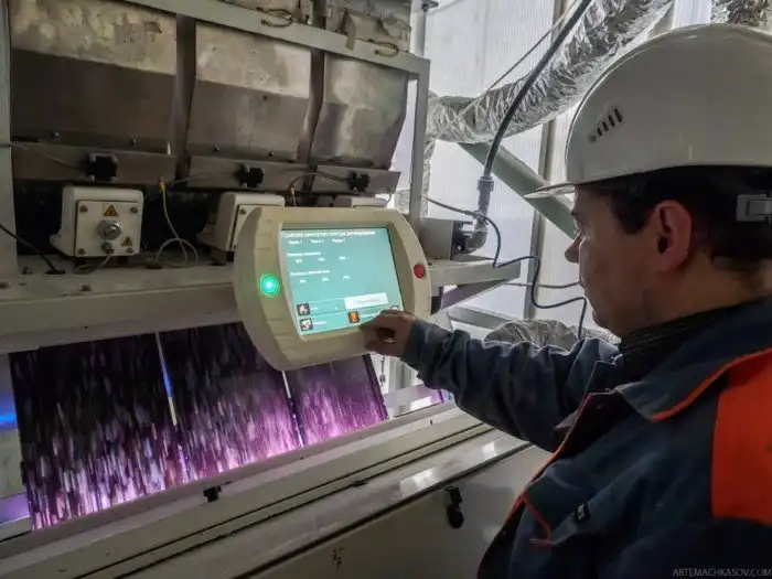 Бутылочные хлопья проходят процедуру финальной индуктивной металлосепрации, после чего специальный компьютерный станок отбирает бракованные флексы другого цвета.