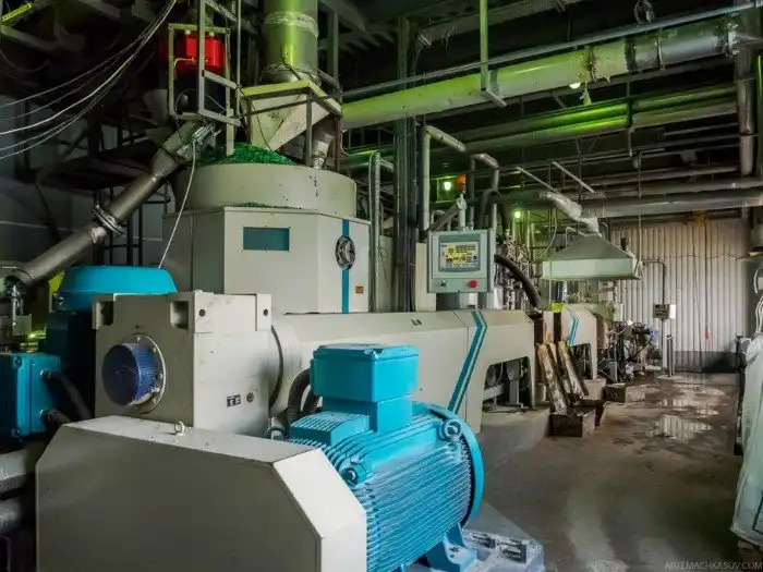 После этого хлопья пневмотанспортом подаются в третий цех — на линии экструзии и гранулирования. Процесс полностью автоматизирован.