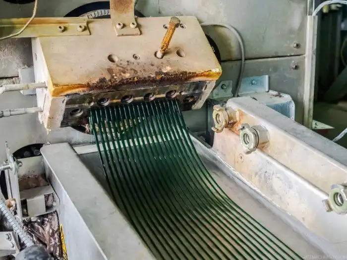 Специальная через фильеру выдавливает из расплавленного и очищенного пластика тонкие нити (стренги), которые осушаются и режутся на гранулы.
