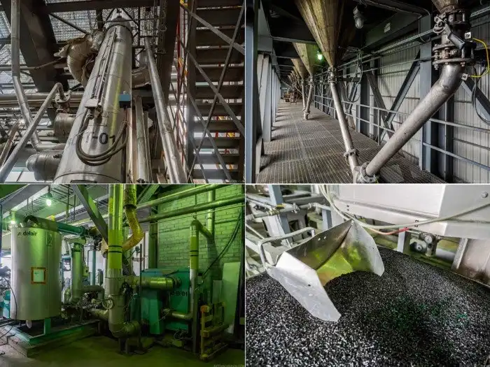Процесс в третьем цеху состоит из нескольких этапов. Во первых, повторное металлоотделение, потом предварительный разогрев, удаление ацетальдегида и других вредных примесей, фильтрация. Сначала хлопья режутся в измельчителе, после чего флекс плавится при температуре 280 градусов Цельсия.