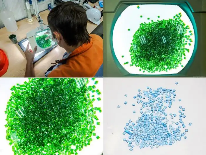 Несколько бригад рабочих вручную сортируют бутылки, срезают этикетки, выкидывают затесавшийся мусор и тару, которая не может быть переработана, например, целиком затянутую в термоусадочный пластик, с посторонними предметами внутри или нестандартного цвета. Для переработки подходят только голубые, коричневые, бесцветные и зеленые бутылки. Последние, к слову, пользуются наименьшей популярностью у заказчиков.