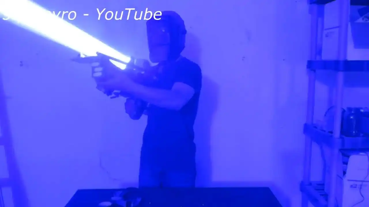 Styropyro изготовил свою мощнейшую лазерную пушку из различных деталей, найденных им на свалке старой электроники. Работает девайс таким образом, что генерирует несколько лазерных лучей, которые затем фокусируются в один мощный луч при помощи линзы. Базука работает от литий-полимерных батарей, но яркость получаемого на выходе лазера настолько велика, что если направить этот лазер в глаза человека, то эффект будет в 33 миллиона раз страшнее, чем если бы он просто посмотрел на Солнце. Именно поэтому создателю пушки приходится стрелять из неё исключительно с надетой на голову сварочной маской.