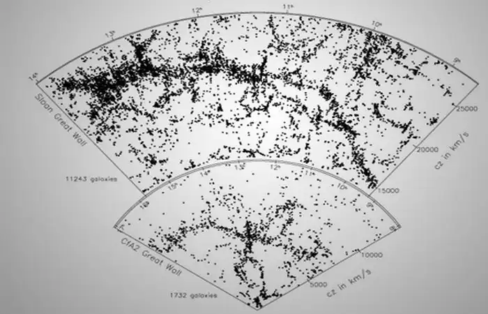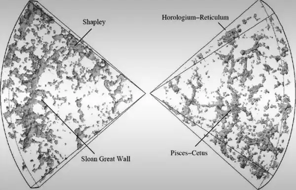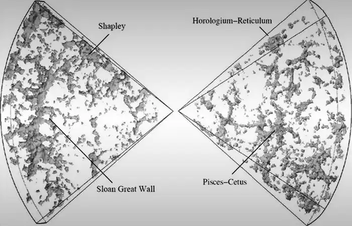 Ученые считают, что распределение материи во Вселенной не является случайным. Было высказано предположение, что галактики организованы в огромную универсальную структуру в виде нитевидных волокон или скоплений "перегородок" между огромными пустотами. Геометрически структура Вселенной больше всего напоминает пузырчатую массу или соты. Внутри сот, размер которых составляет примерно 100 миллионов световых лет, практически отсутствуют звезды и какая-либо материя. Такая структура была названа "Космической паутиной".