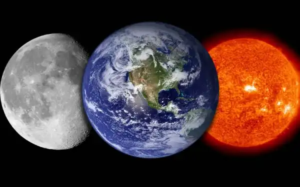 Луна в 400 раз меньше Солнца, но в 400 раз ближе к Земле. Геометрия расположения Земли, Солнца и Луны необыкновенна, хотя очевидна. Видимые размеры Солнца и Луны почти одинаковы. И благодаря этому и тому, что в эклиптике так расположены эллипсы орбит, мы моем наблюдать оба затмения. В этом же причина того, что Лунные затмения видятся нам, будто Луна красная.