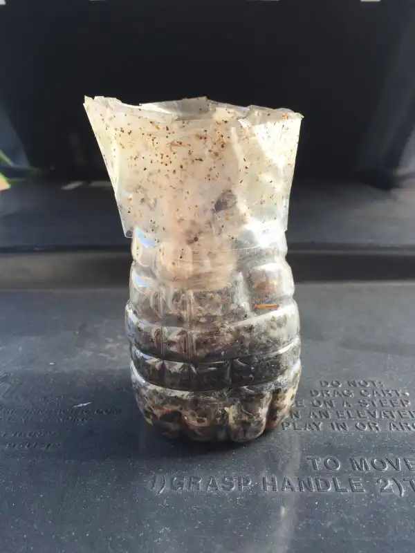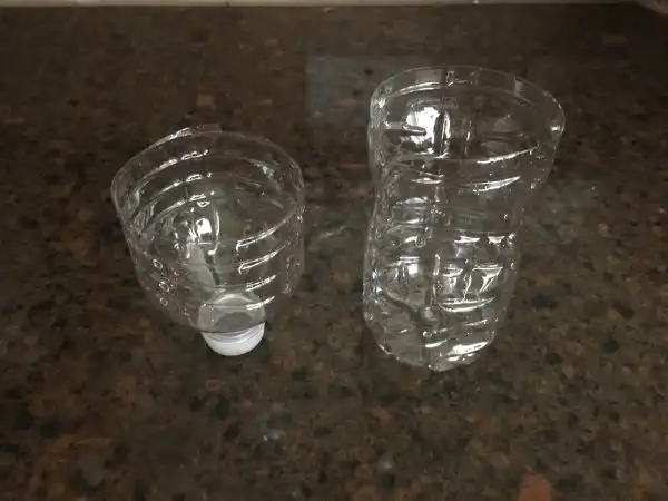 Поместите верхнюю часть бутылки внутрь, горлышком вниз (как изображено на фото). И не забудьте удалить крышечку бутылки!