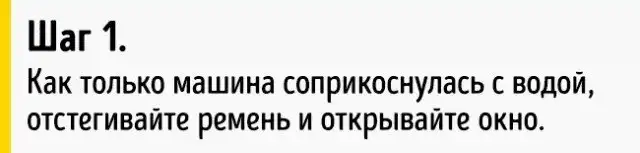 Не тратьте время, пытаясь открыть дверь. Она все равно не поддастся, поскольку вода давит на нее снаружи. Последовательность: «отстегнуть ремень, открыть окно и выбираться» — это ваш реальный шанс на спасение.