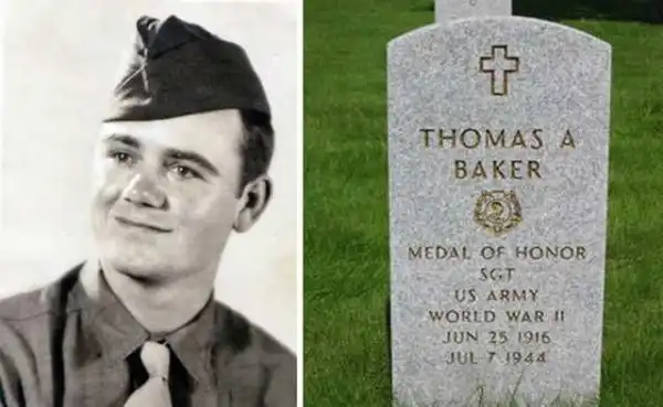 Во время Второй мировой войны между 19 июня и 7 июля Томас Бейкер продемонстрировал исключительную отвагу добровольно пробежав с базукой в 90 метрах от врага, когда его компания была окружена, несмотря на то, что на него был направлен пистолет.