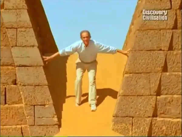 Такое возможно только с Нубийскими пирамидами и нельзя в Египте: одновременно дотронуться до двух пирамид. Египтолог Боб Брайер. Кадр из фильма: "Пирамиды, мумии, гробницы".