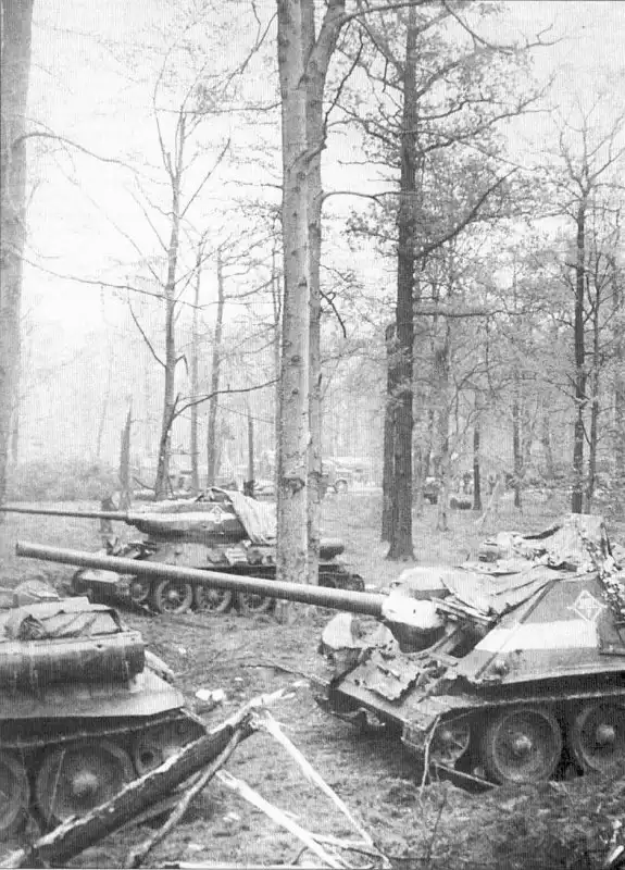 На фото: Советские САУ СУ-100 и танки Т-34-85 под Берлином.