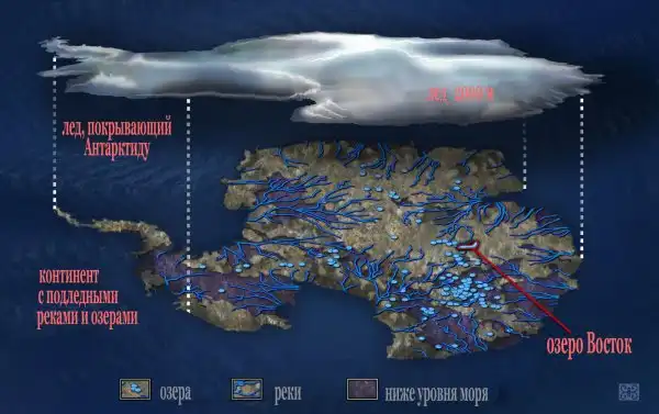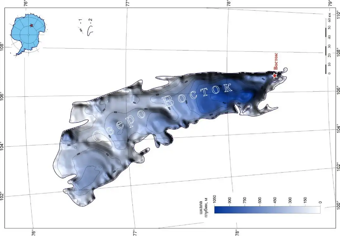 Это была грандиозная находка. Обнаруженное озеро было настолько крупным, что с легкостью вошло бы в топ-20 пресноводных водоемов всей Земли. Длина — 250 километров, ширина — до 50 километров, площадь — без малого 16 000 квадратных километров. Одиннадцать островов и подводная гряда, разделяющая озеро на две части: глубоководную южную (глубина до 800 метров) и мелководную северную (около 400 метров). И над всем этим мощный ледяной панцирь толщиной от 3,5 до 4 километров, благодаря чудовищному (более 300 атмосфер) давлению которого средняя температура воды на поверхности Востока составляет минус 3°C.