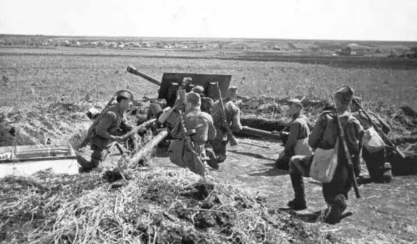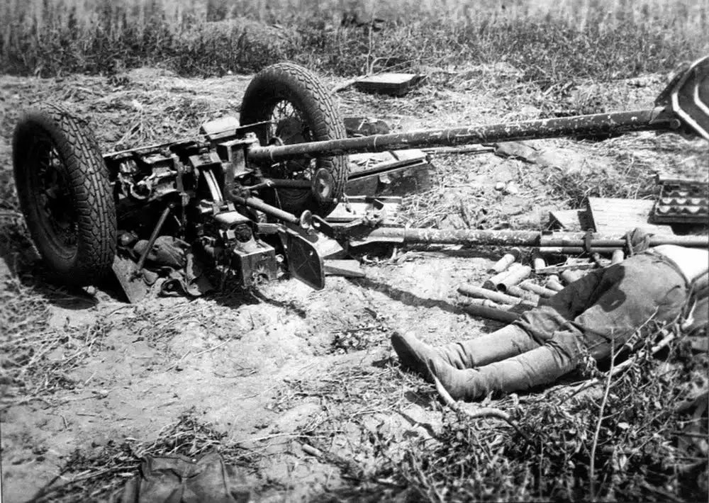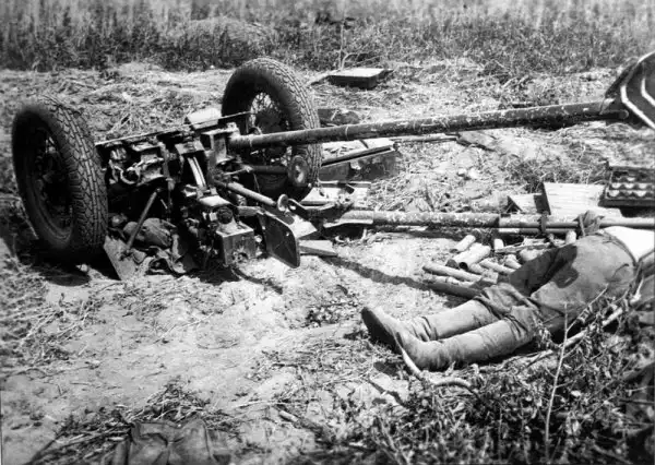 На фото: Уничтоженная 45-мм противотанковая пушка.