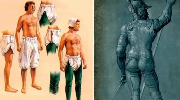 Т. к. рыцарь чаще всего оставался на коне, то нижняя часть его облачения не была закована в броню. Штанов в современном понимании тогда не было. Поверх нижнего белья надевались чулки, которые завязывались веревочками на талии. Спереди был гульфик, представлявший треугольник из ткани, больше напоминавший мешочек. Поэтому, если рыцарю необходимо было по малой нужде, то снимать с себя все вовсе не являлось обязательным.