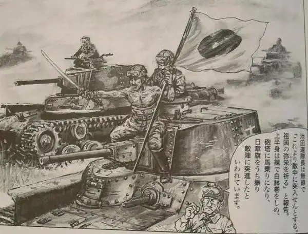 Пожалуй, единственное, в чём совершенно единодушны обе стороны, — это описание полковника Икеды в его последнем бою. По японским источникам, командир 11-го танкового полка возглавлял атаку, наполовину высунувшись из башни, со знаменем в руке. Таким его и запомнили...