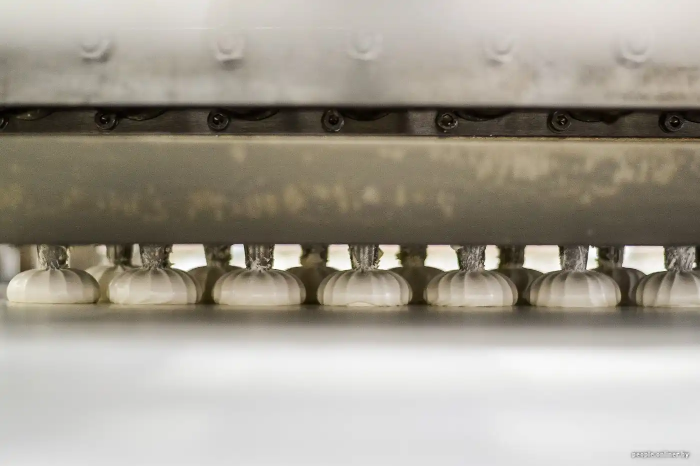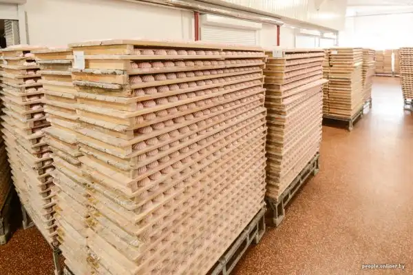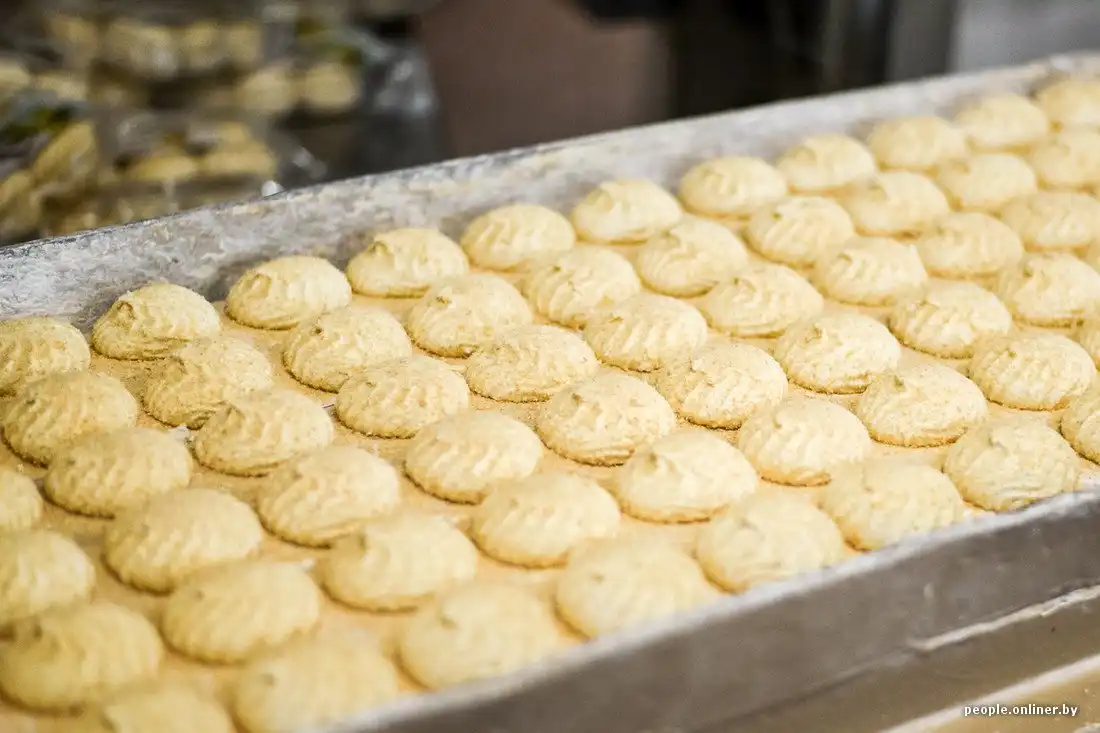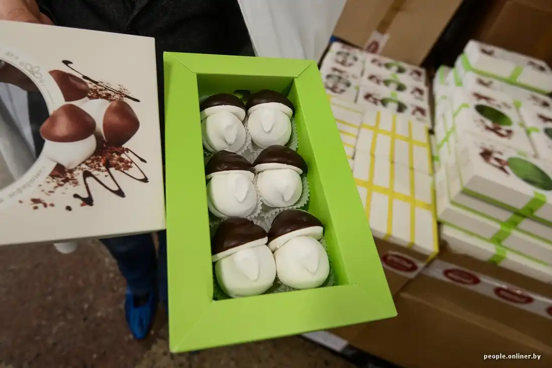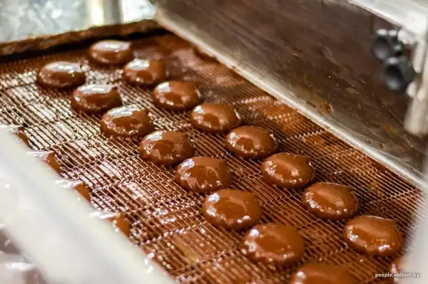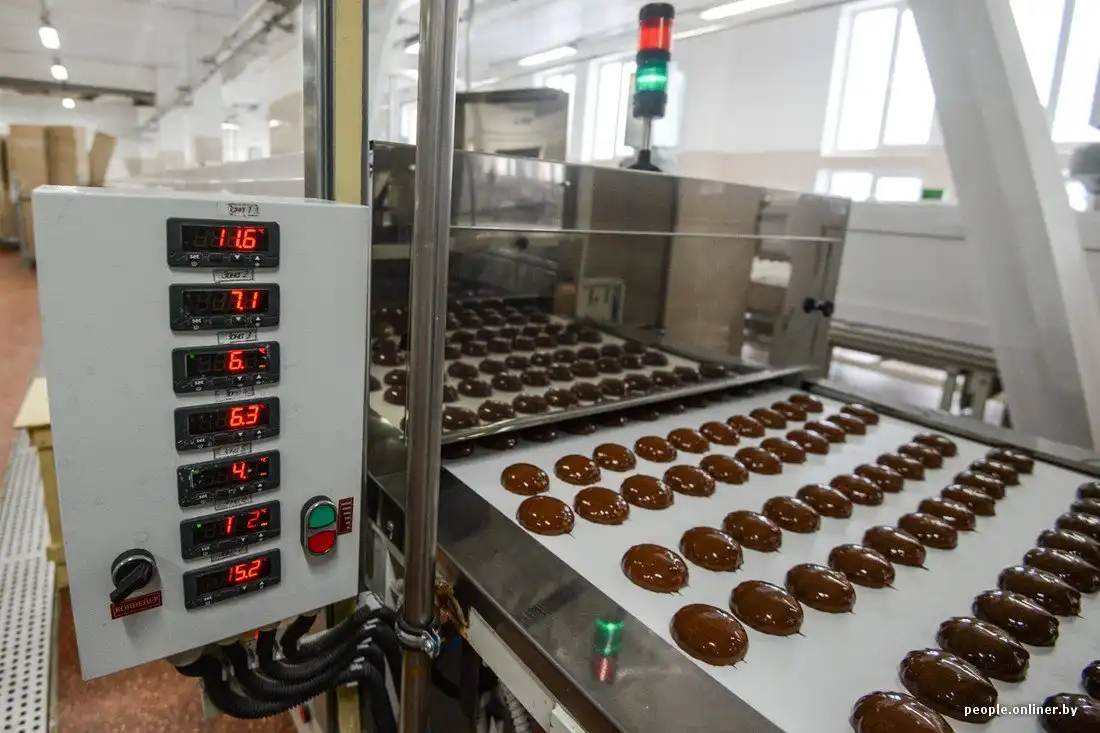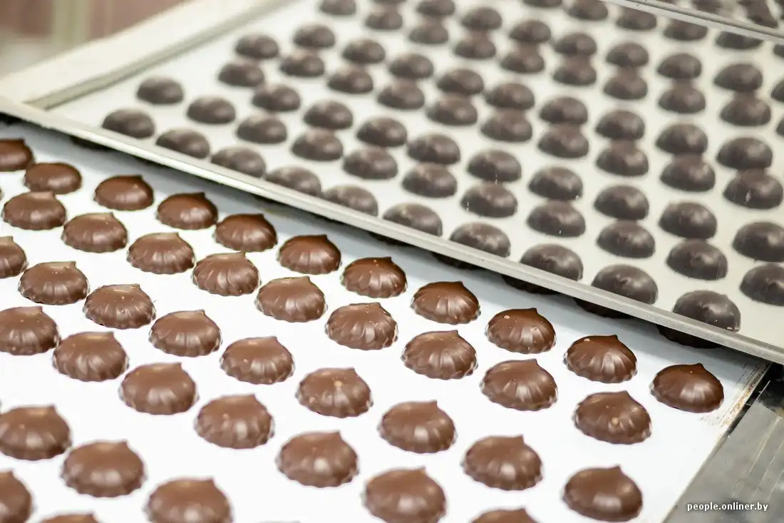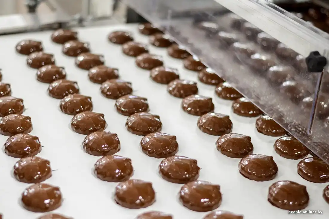 Он проходит через длинный тоннель, в котором успевает охладиться и подсохнуть. Весь процесс занимает ровно 52 минуты. Дальше половинки покрывают натуральным шоколадом (как правило, белорусского производства — той же «Коммунарки» или «Спартака»). После этого партия отправляется в еще один тоннель для охлаждения шоколада.