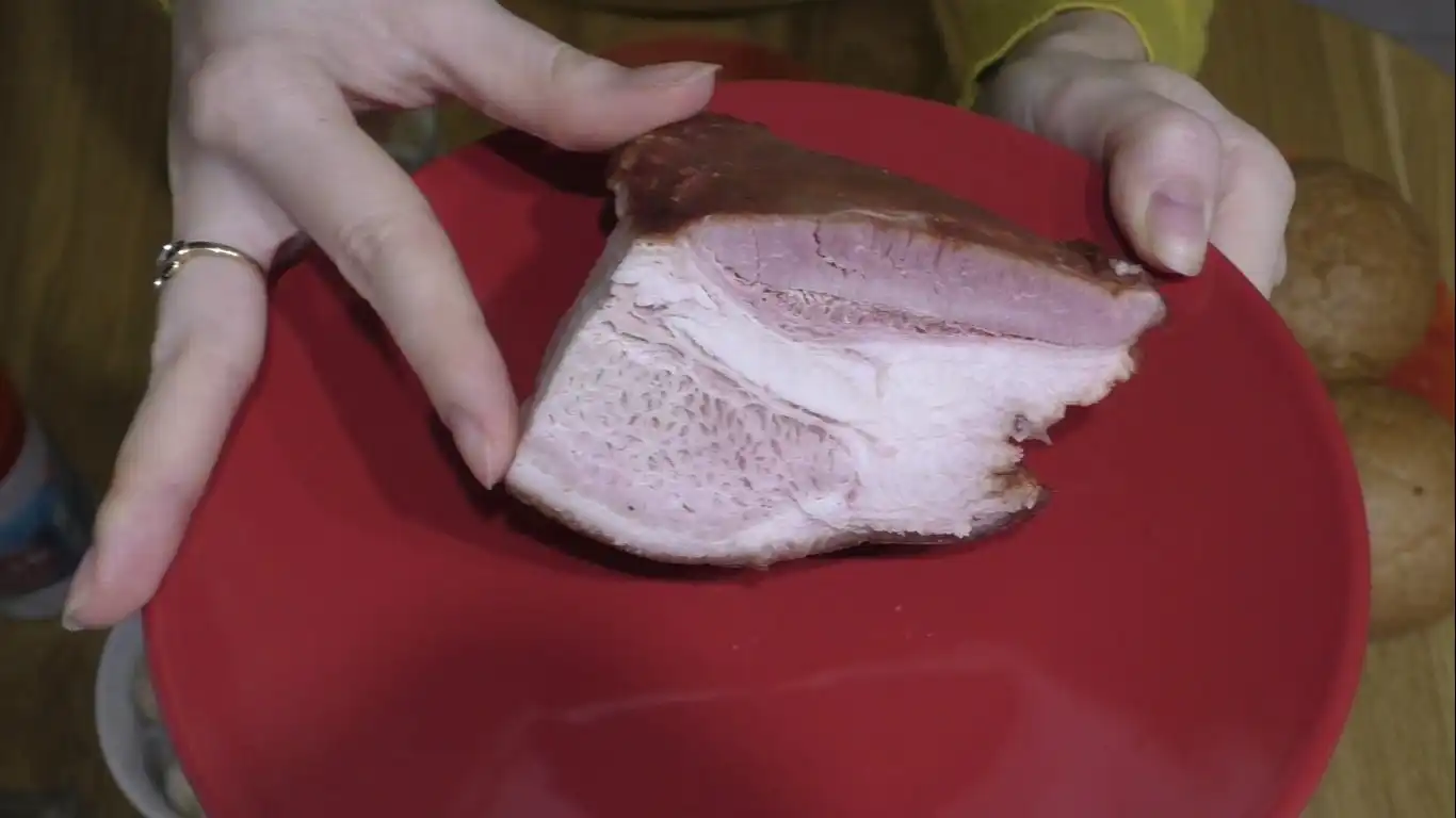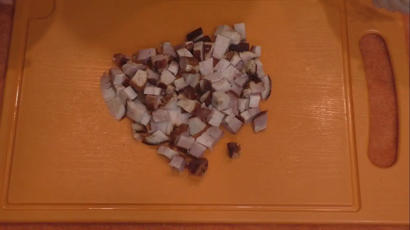 Для тех, кто не употребляет грибы в пищу по тем или иным причинам, готовим второй вариант. Для этого, вместо грибов будем использовать грудинку или бекон.