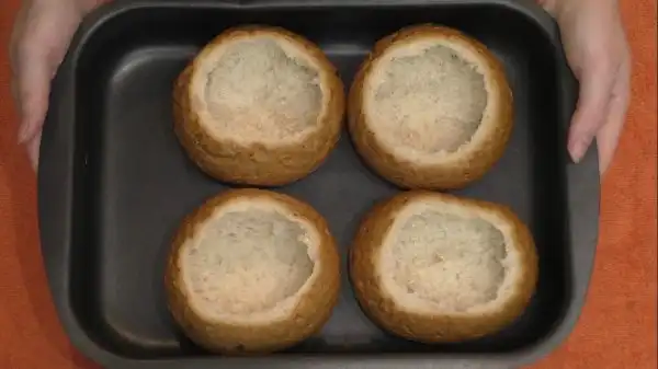 7. Займитесь приготовлением булочек. Для этого аккуратно выньте из них весь мякиш, как показано на фото.