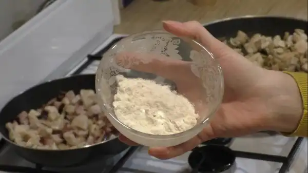 5 Добавьте в каждую сковородку по 2 столовые ложки муки и хорошо размешайте. В грибной жульен дополнительно добавьте сливочное масло.