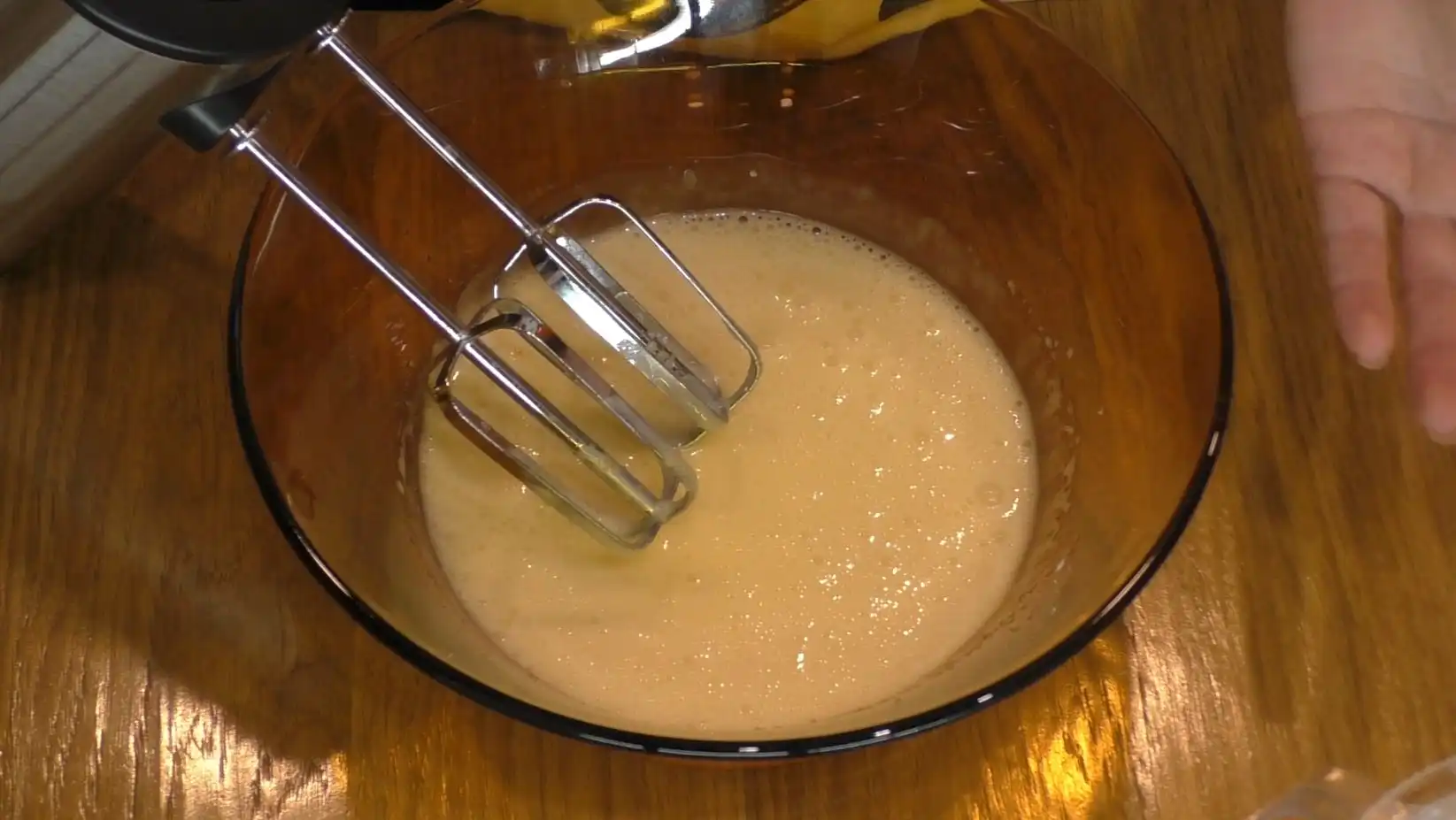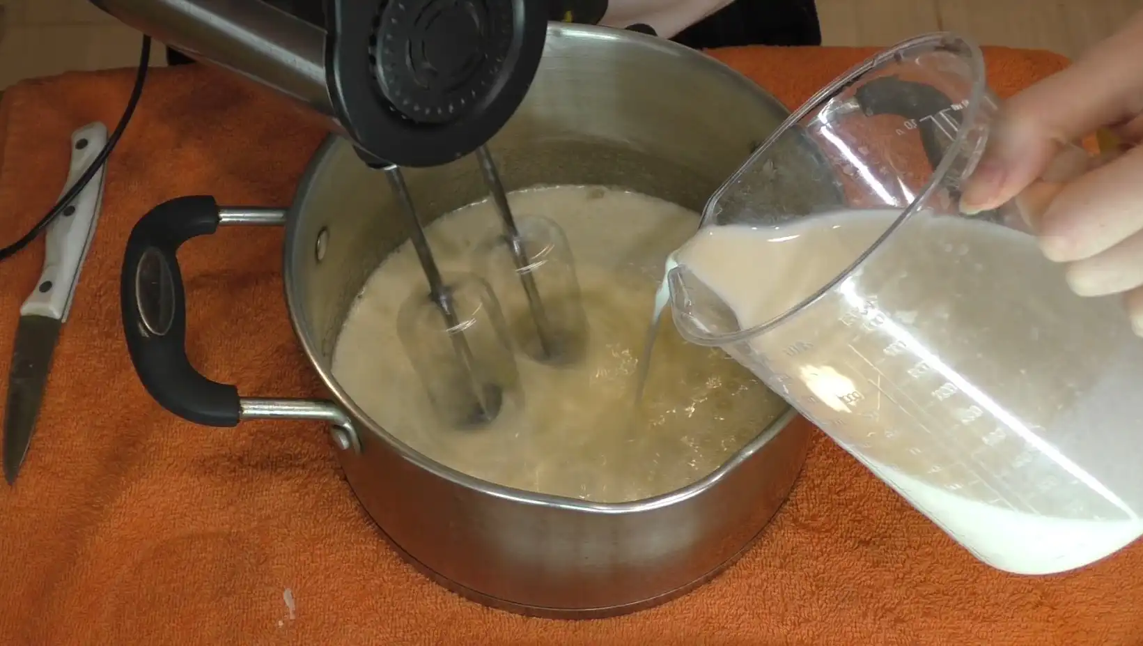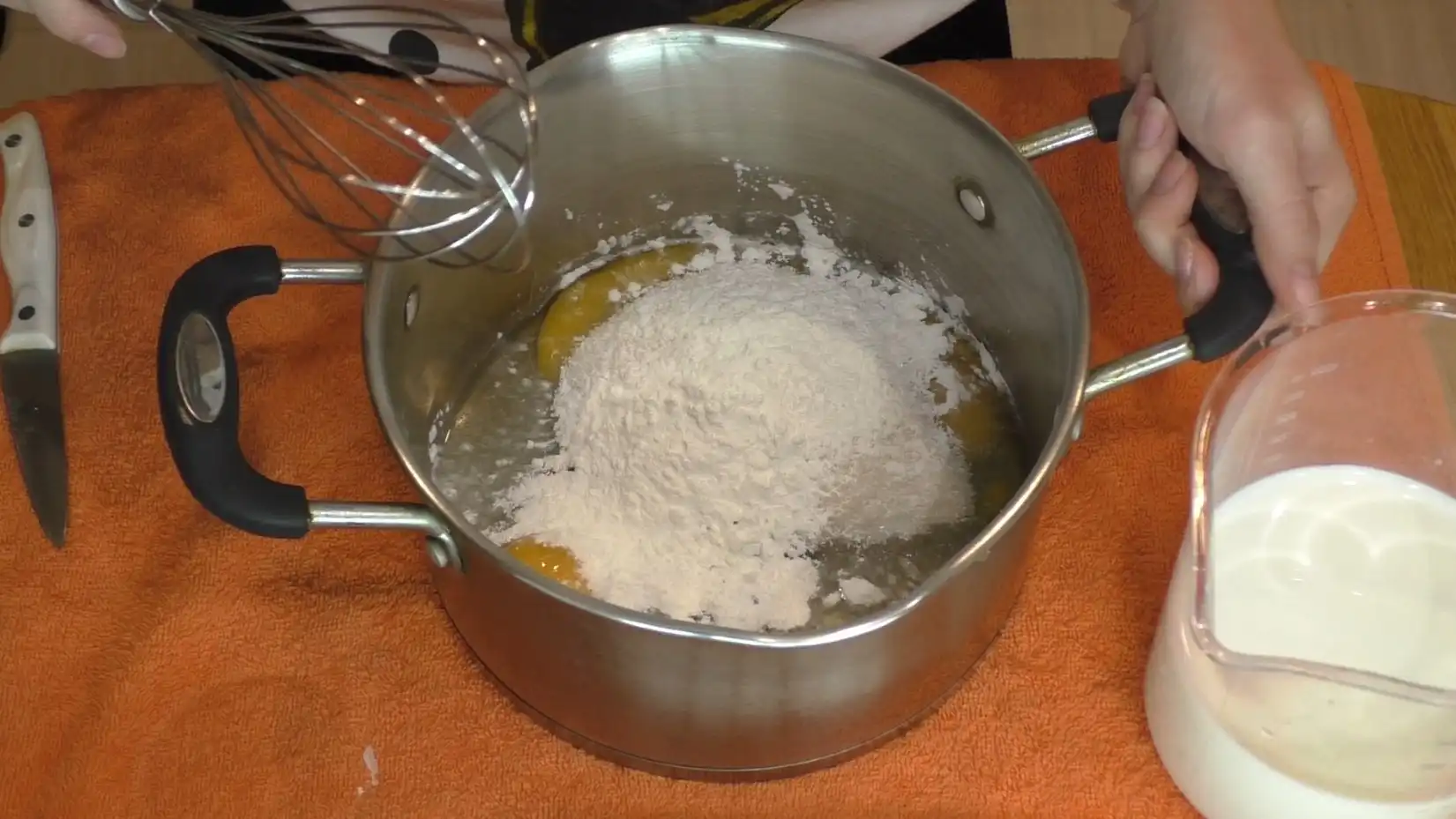 В полученную массу нужно тонкой струйкой влить молоко и при этом взбивать все миксером или венчиком.