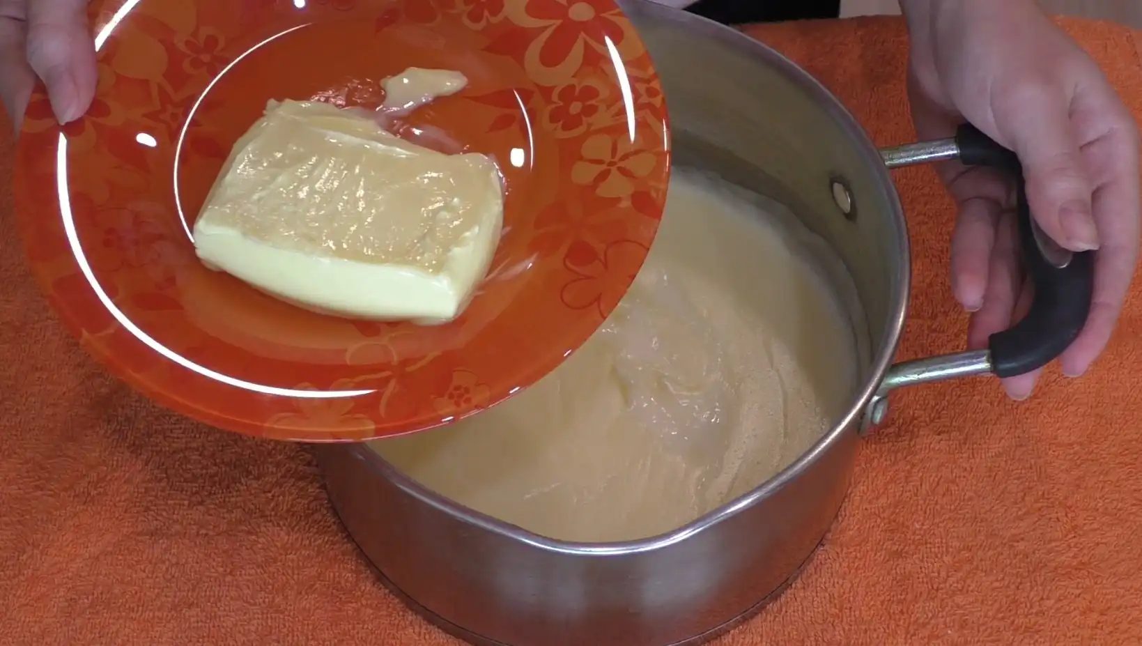 Кастрюлю с кремом поставьте на медленный огонь и доведите крем до кипения, после чего хорошо его остудите. Добавьте сливочное масло и снова взбейте миксером.