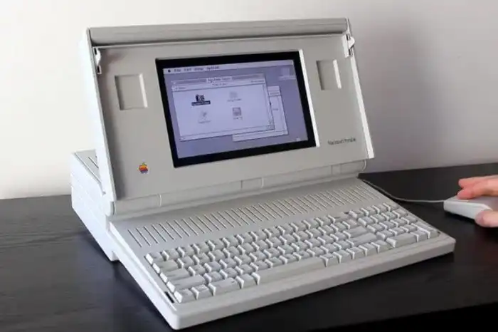 Первый портативный компьютер компании. Весил он 7 кг и стоил 6500 долларов! К тому же устройство работало лишь при заряженном аккумуляторе.