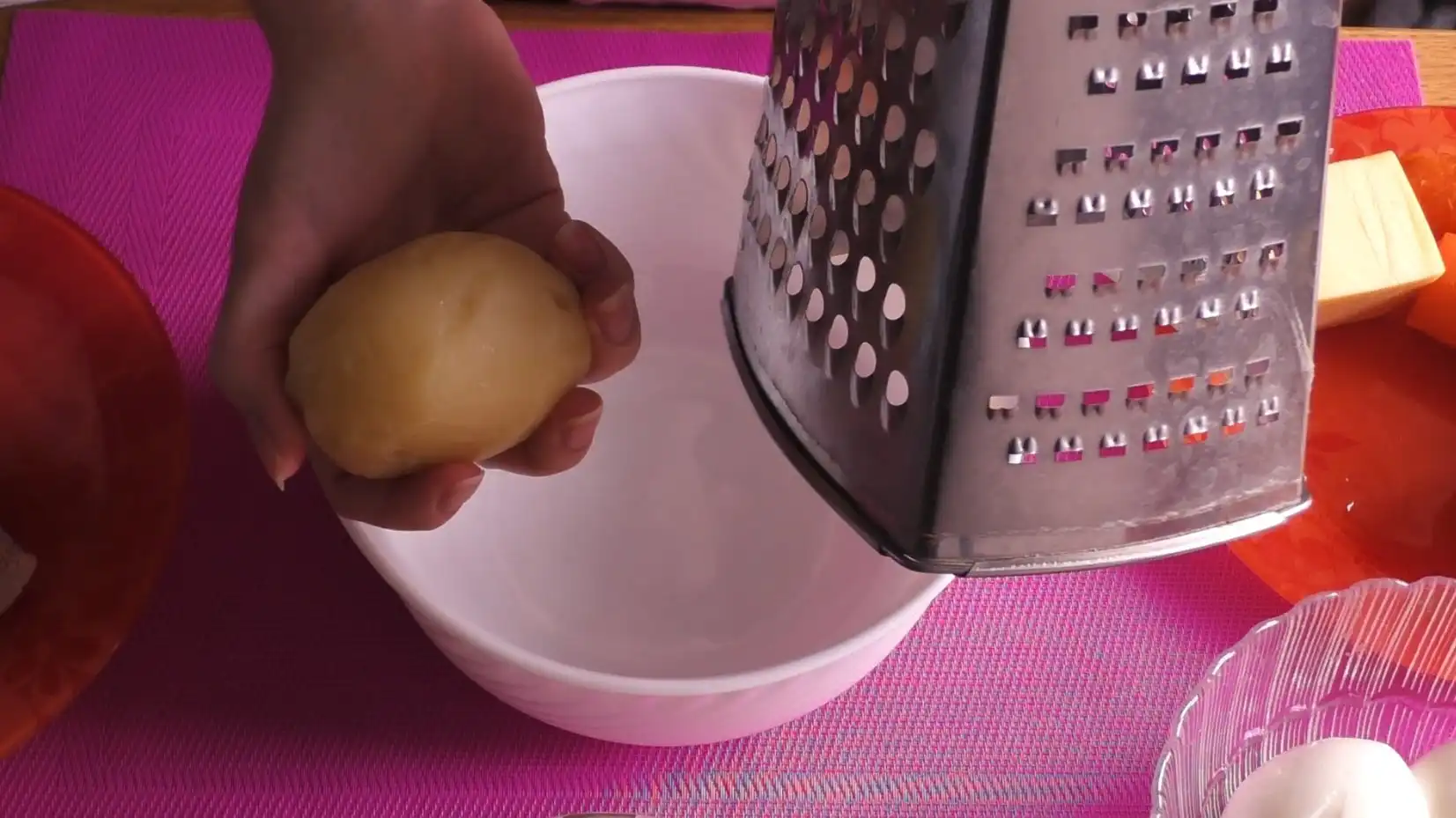 1. Первым слоем будет отварной картофель, который необходимо измельчить с помощью овощетерки, немного подсолить и хорошо промазать майонезом.