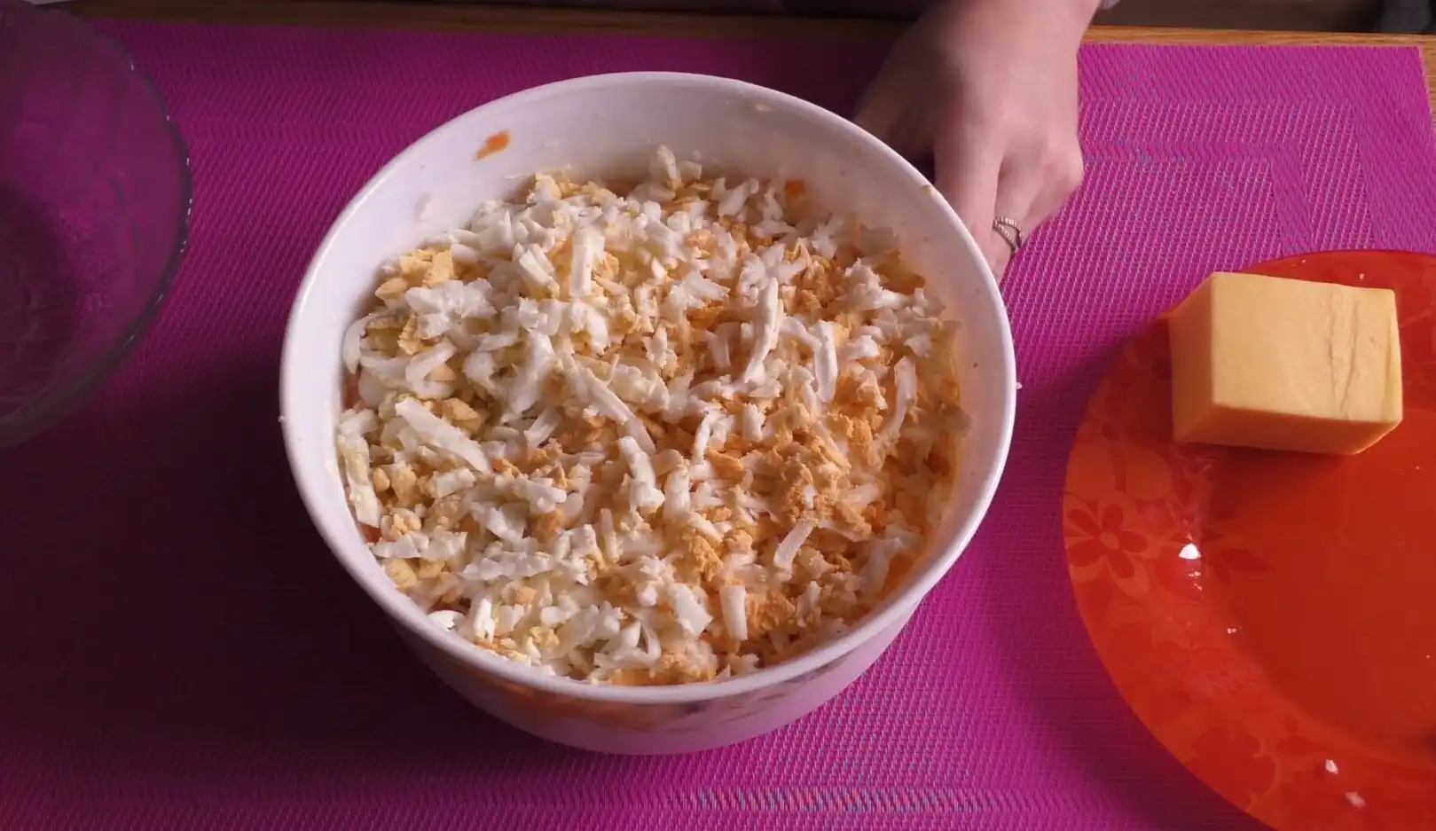 5. Пятым слоем располагаются тертые яйца, хорошенько подсоленные и тоже сдобренные майонезом. Можете оставить один желток для украшения салата, а можете этого не делать и украсить салат по вашему усмотрению.